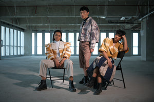 Corak khas shibori arashi dan motif abstrak dari hand painting ini tak hanya serasi dengan paduan ragam denim, tetapi juga harmonis dengan gaya pattern on pattern–menggabungkan corak hasil metode cat ikat dan percik cat tangan yang abstrak.