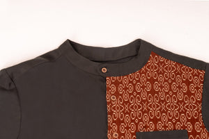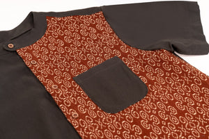 A fitting loose short sleeve shirt, suitably used for daily activities outside and inside the home. A casual style with embroidered accents on the front side combined with handmade woven and naturally dyed.