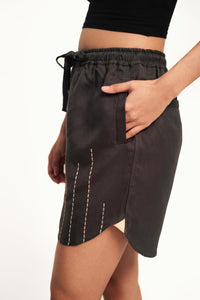 A fitting loose short pant, suitably used for daily activities outside and inside the home. A casual style with embroidered accents on the front side combined with handmade woven and naturally dyed.