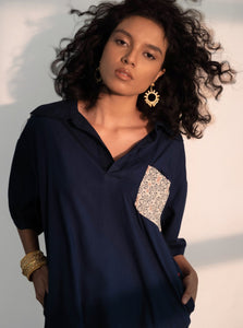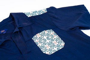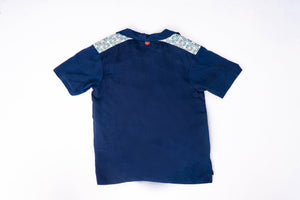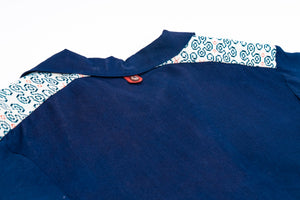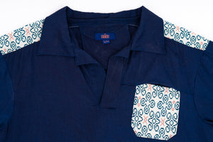 A fitting loose short sleeve shirt with open collar polo type, suitably used for daily activities outside and inside the home. A casual style with embroidered accents on the front side combined with handmade woven and naturally dyed.