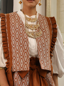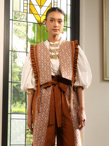 Large embroidery of roses is directly inspired by the tradition of medieval glasswork, especially stained glass panels. Meanwhile, ruffle, patch, and piping details are a callback to English wallpaper designs in the 19th century. Combining two traditions with our beloved ‘Habut’ motif in two new colours, ‘Jemari’ highlights the beauty in the carefulness of creating and crafting.