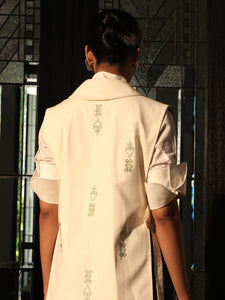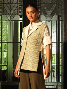 Large embroidery of roses is directly inspired by the tradition of medieval glasswork, especially stained glass panels. Meanwhile, ruffle, patch, and piping details are a callback to English wallpaper designs in the 19th century. Combining two traditions with our beloved ‘Habut’ motif in two new colours, ‘Jemari’ highlights the beauty in the carefulness of creating and crafting.