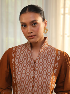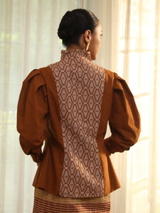 Large embroidery of roses is directly inspired by the tradition of medieval glasswork, especially stained glass panels. Meanwhile, ruffle, patch, and piping details are a callback to English wallpaper designs in the 19th century. Combining two traditions with our beloved ‘Habut’ motif in two new colours, ‘Jemari’ highlights the beauty in the carefulness of creating and crafting.