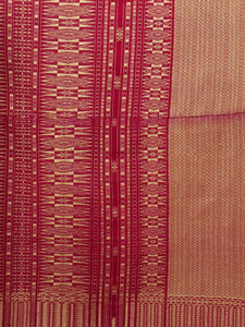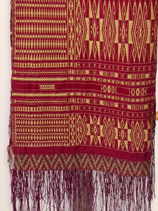 Originating from Silindung, Tumtuman is a versatile type of ulos that can be modified using various motifs, even those borrowed from other cultures. Traditionally, it is used as a tali tali or headwrap by the host’s (hasuhutan) firstborn son to denote his status during ceremonies. Nowadays, it is most commonly used as a sarong and shawl by women in formal settings, especially weddings.